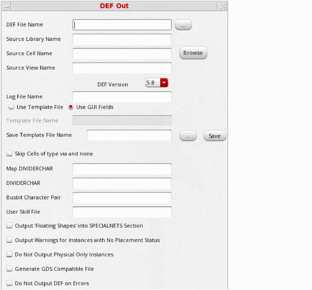 Use the Use GUI Fields option to specify the DEF Out options through the GUI form. This is the default option.