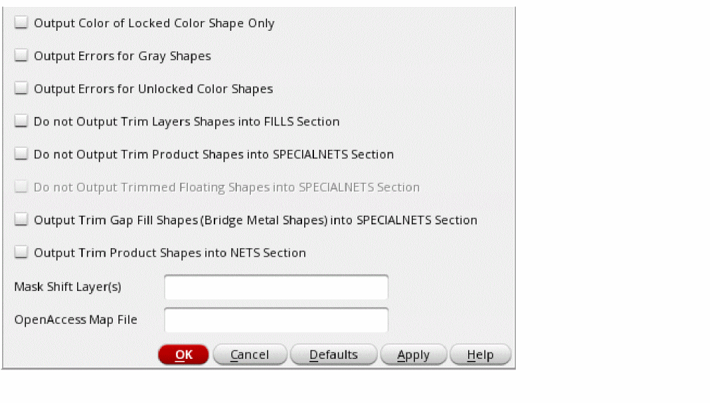 Use the Do Not Output Trim Layers Shapes into FILLS Section to prevent the output of trim layer shapes into the FILLS section.