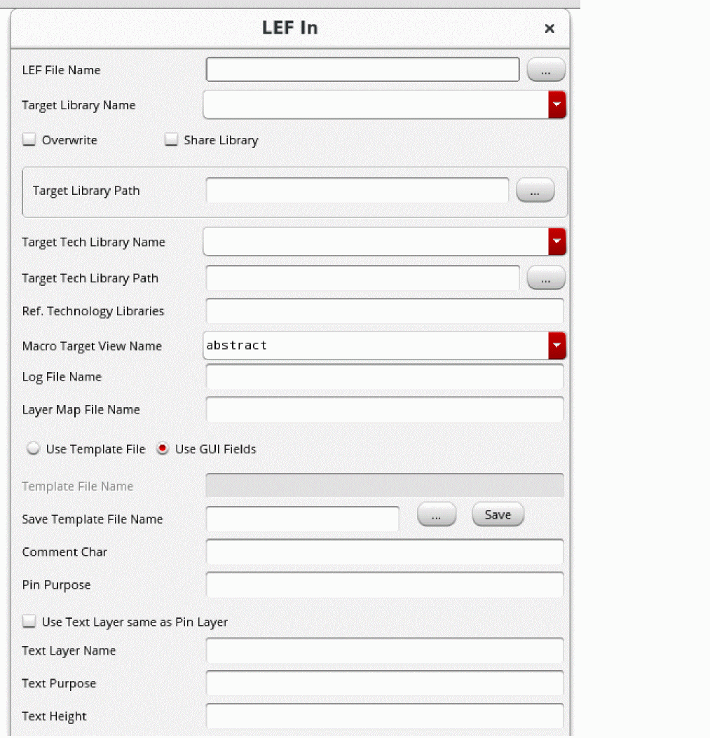 A template file is a collection of file names and option values that reflects the same information given in the LEF-DEF forms. You use the template file to load previously saved information to the LEF-DEF forms or to load the arguments that are required in the forms. You create a template file in the following ways: