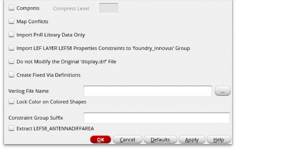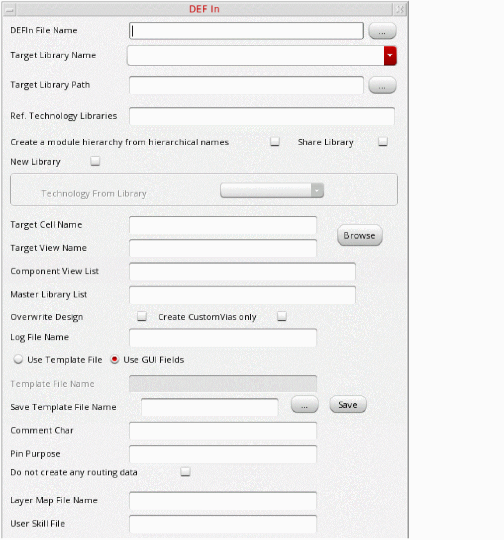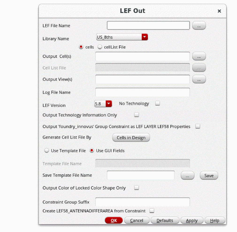 - Use the Template File Name command in the LEF In. LEF Out, DEF In or DEF Out forms to save the information currently entered in the form. The information is saved to the file you specify as the template file.