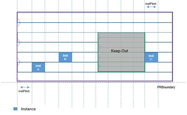 PR boundary: Instances are placed on all overlapping row regions that exist within the PR boundary. Instances are placed in row regions according to their allowed component types. When an instance is placed in the outer row region, the inner row region is considered blockage. In case of partial overlap between two row regions, nothing is placed in the overlapping area.