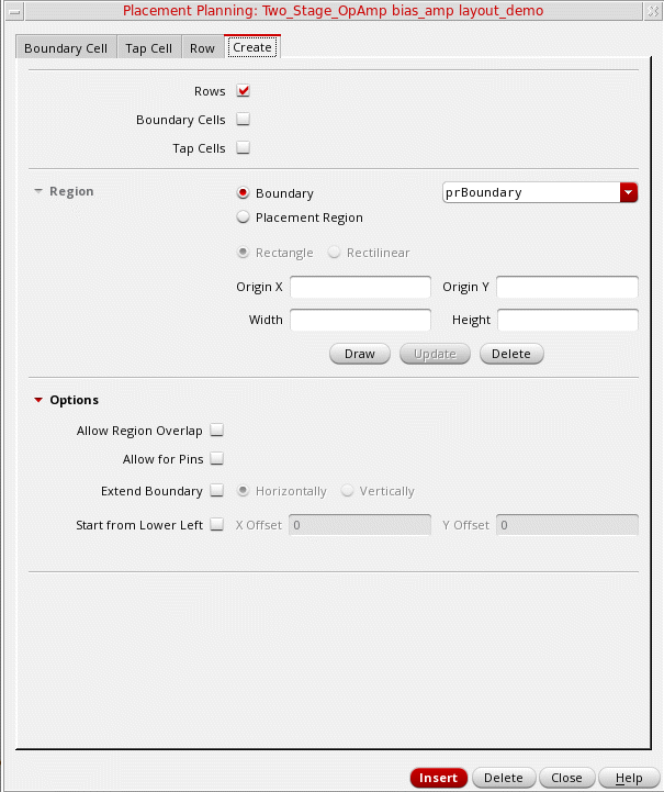 - Type the X and Y coordinates of the lower-left corner of the region in the Origin X and Origin Y fields. Notice the X and Y coordinates of the cursor position in the status line at the top of the layout window. If you do not type any coordinates, the new row is placed at the lower-left corner of the region.