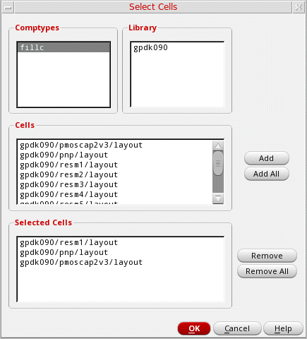 - Select the required Comptypes. The corresponding Library and Cells entries are listed.
