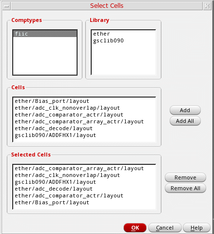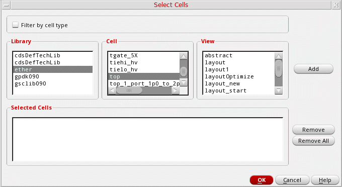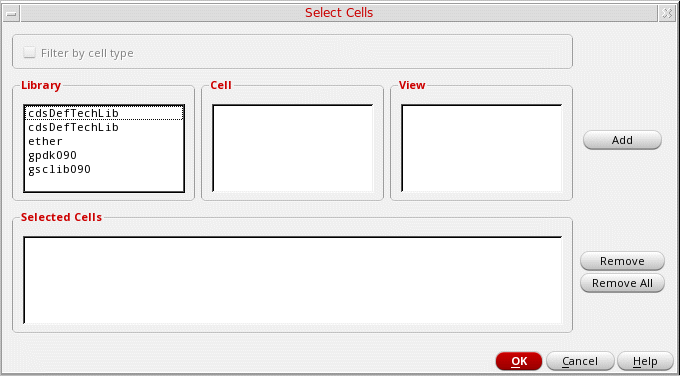 - Click Add. The selected cellviews are listed in the Selected Cells text box.