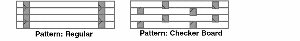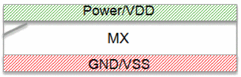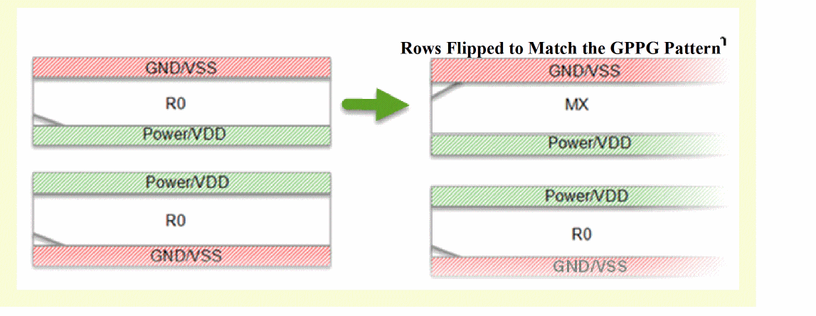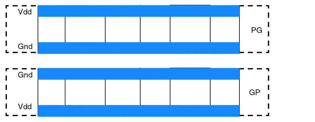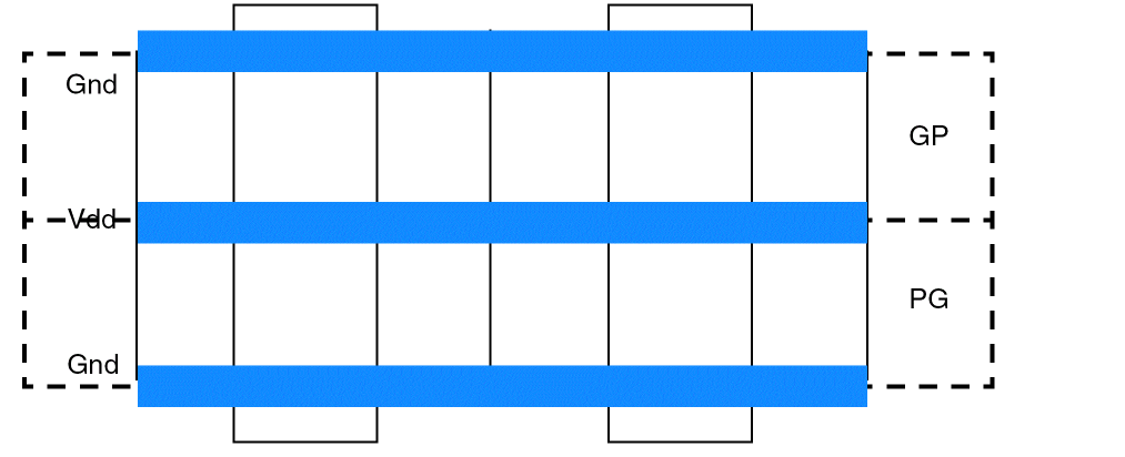 Both PGGP and GPPG rail patterns are supported and these patterns can co-exist in a design to ensure uninterrupted power and ground connectivity to the cells, as shown in the figure below.