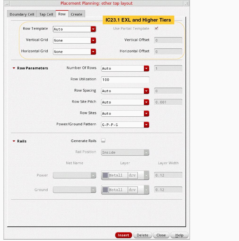 (IC23.1 EXL and Higher Tiers) In the Virtuoso® Design Planner environment, you can use the Placement Planning form to create rows in the PR boundary, cluster boundary, and virtual hierarchy boundary (area boundary).