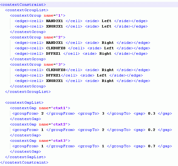 If placement planning needs to be context-aware, define the cell edge and spacing constraints in the technology LEF and the macro LEF. Also, select the Context Aware Placement option on the Placement Planning form. Alternatively, if the constraint information is not defined in the LEF files, provide an XML file that contains the required constraint information. A sample XML file carrying the context information is displayed below.