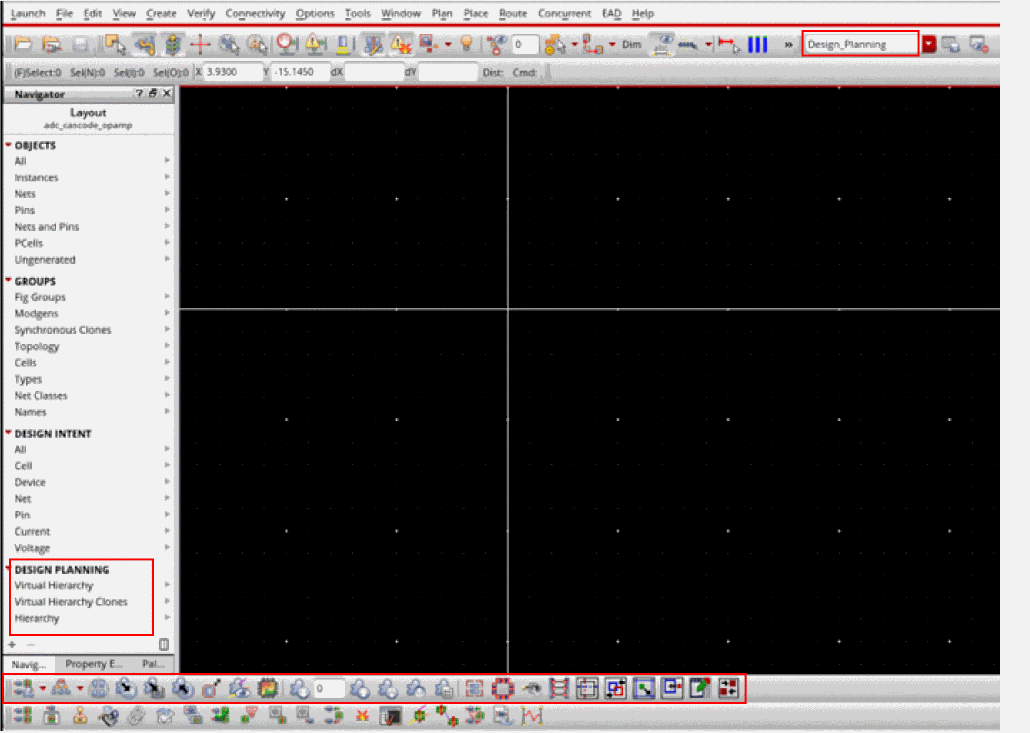 The Design Planning workspace shows the layout canvas, the Design Planning toolbar, and the Navigator assistant. When opened in the Design Planning workspace, the Navigator assistant displays the DESIGN PLANNING category at the bottom, which lists related datasets such as Virtual Hierarchy and Virtual Hierarchy Clones.