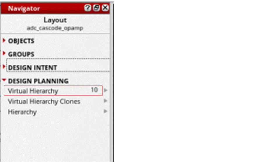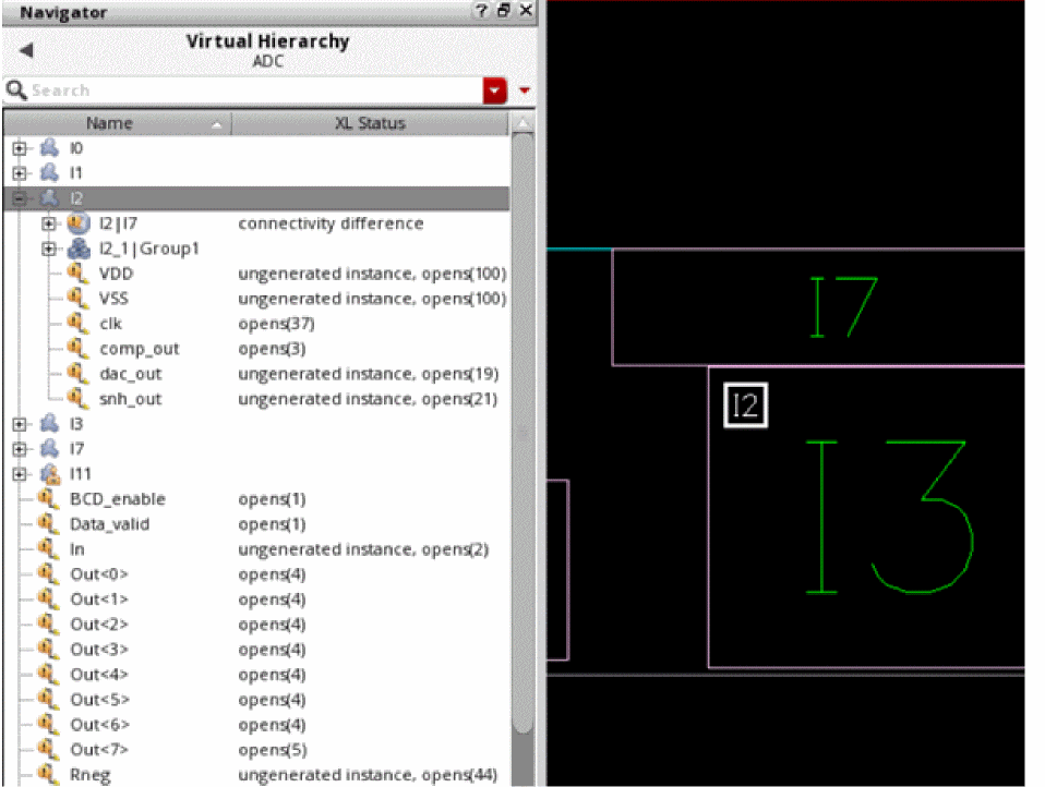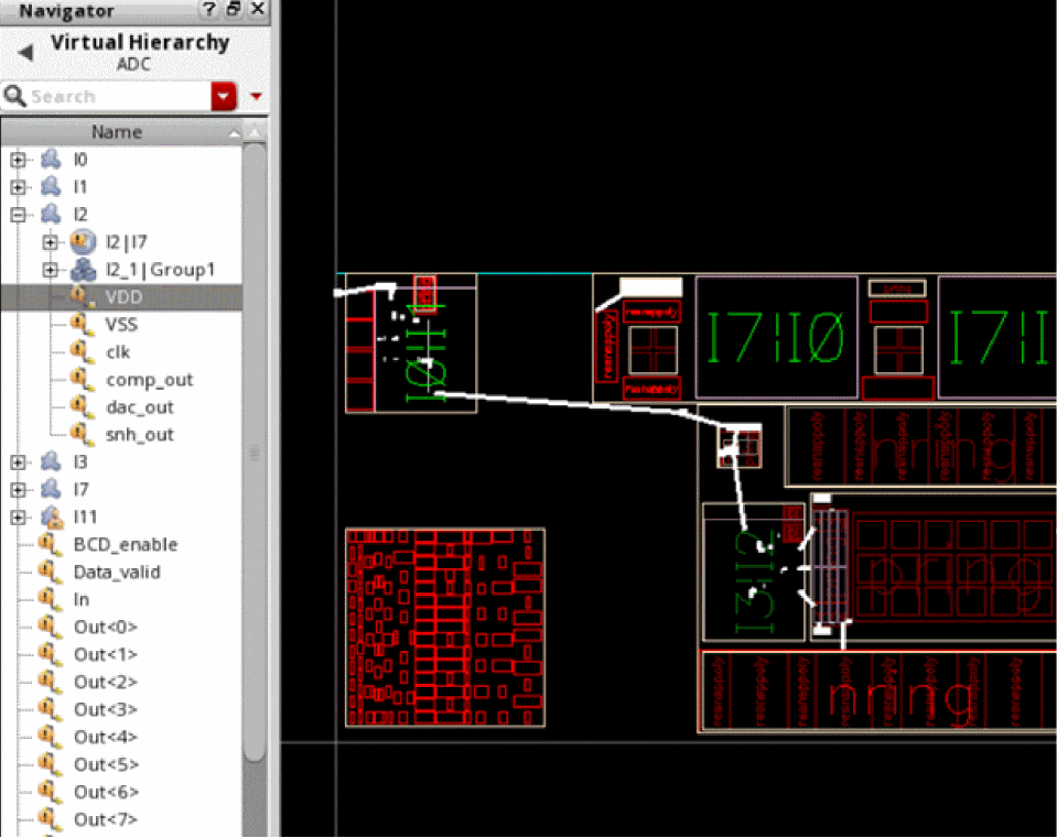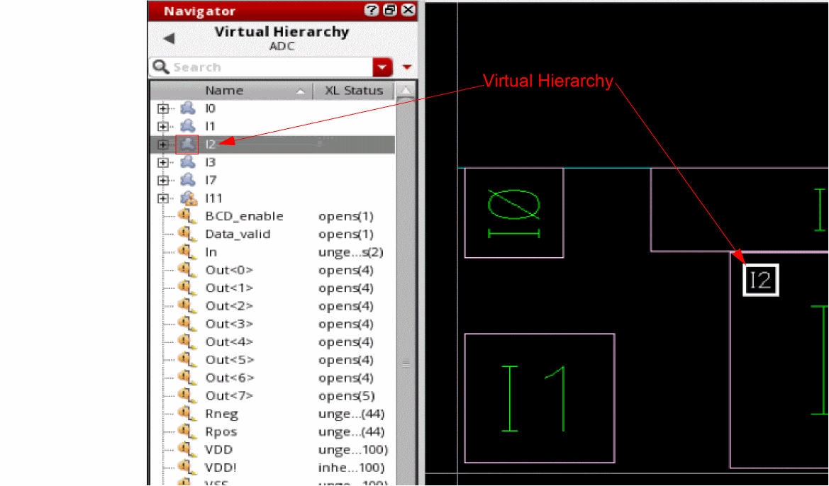 The Navigator tree updates to display the available virtual hierarchies and the associated instances and nets. The virtual hierarchy is represented using an amoeba-shaped icon (