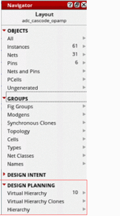 In Virtuoso Layout Suite EXL, the Navigator assistant supports three additional data sets for displaying the generated virtual hierarchies and related components: