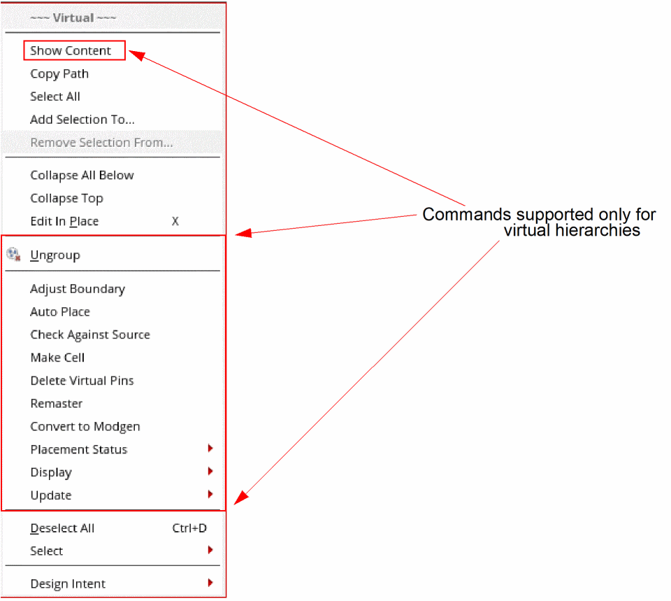 The Virtual shortcut menu is displayed. The shortcut menu provides some generic commands supported in Virtuoso Layout Suite EXL, in addition to a set of commands that are supported only for virtual hierarchies.