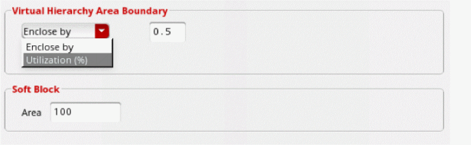 If choosing Utilization (%), type a value in the adjacent field to specify the acceptable area utilization percentage for deriving the size of the area boundary for the virtual hierarchy. This is automatically set to the same utilization percentage as the PR Boundary. Alternatively, set the Layout XLinitUtilizationenvironment variable. - Choose the appropriate hierarchy level for which the area boundary settings must be applied.