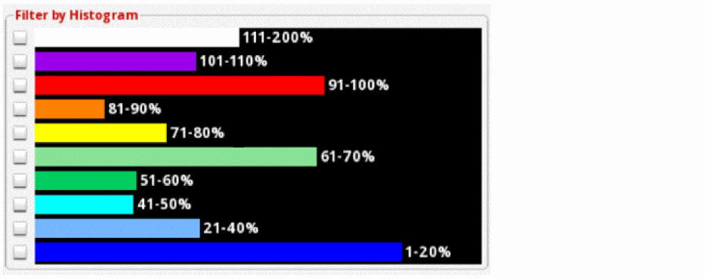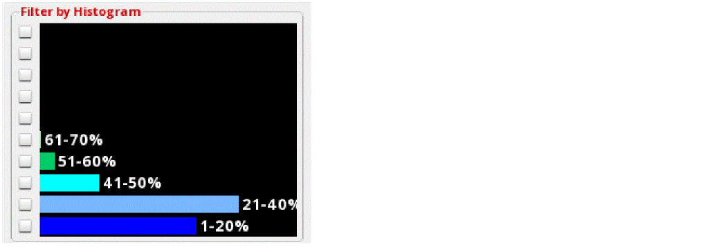 The following figure shows an example of a design that is less congested. Most of the gcells are present in the 1-20% and 21-40% buckets. Therefore, there are lots of available tracks throughout the design.