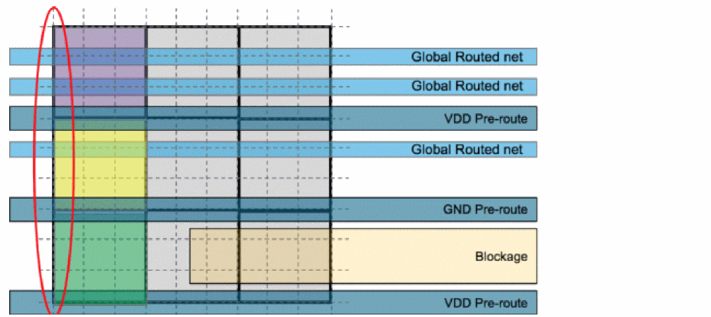 - Gcell #1 (in Purple) has a horizontal capacity of three tracks but has 0 tracks available (0% free)