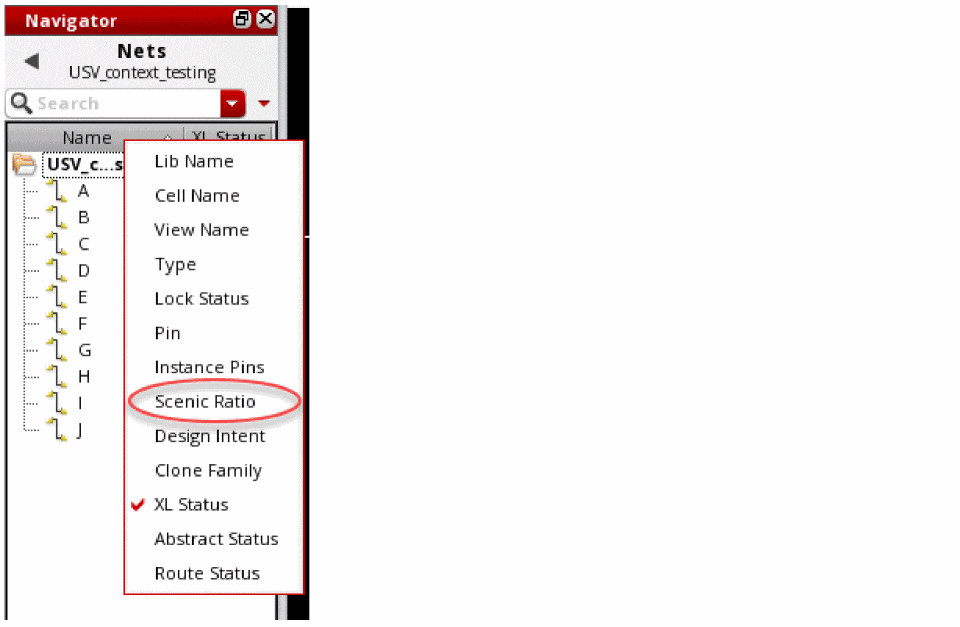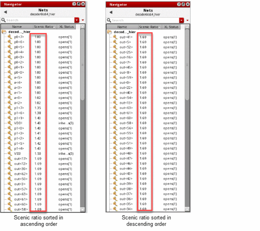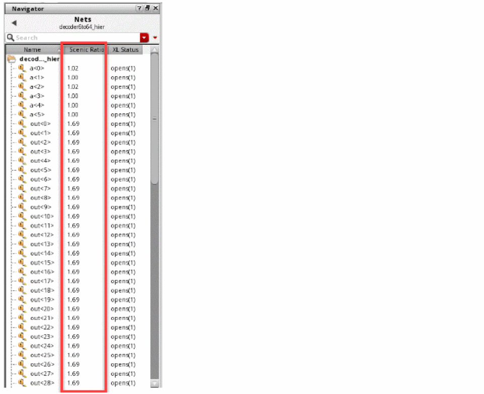 The Scenic Ratio column is displayed in the Navigator Assistant pane. This column displays the value of the scenic ratio for all nets in the design.