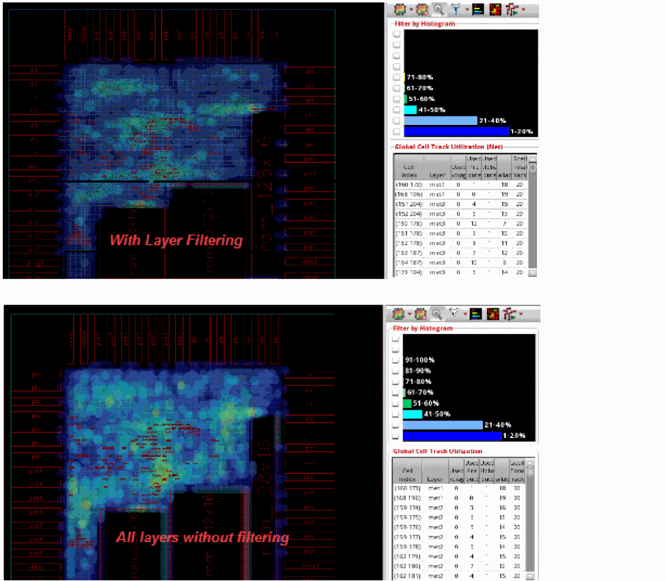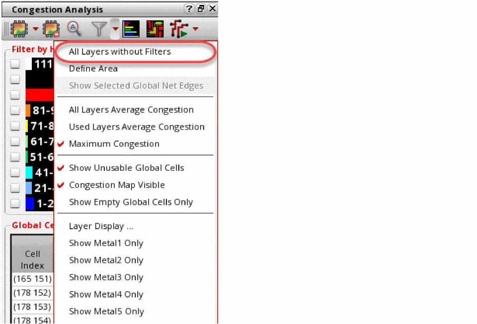 The following figure shows the congestion analysis results when the All Layers without filtering option is selected.