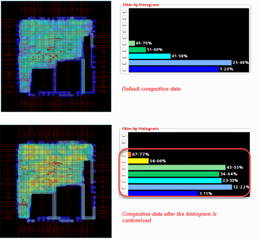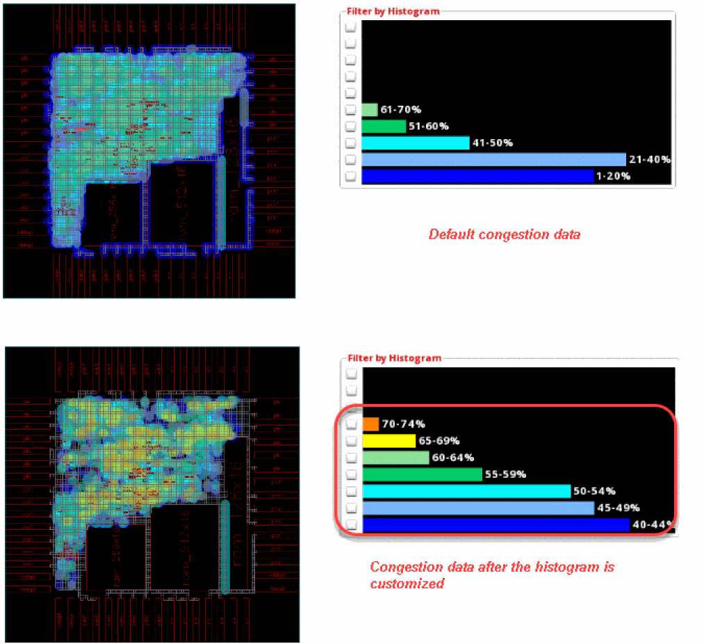 The following figure shows an example where the histogram starts at the 40% value with an interval of 5% in each bucket. The histogram is updated to only display congestion data for the upper buckets. As can be seen, most of the congestion is in the 40-44% bucket.