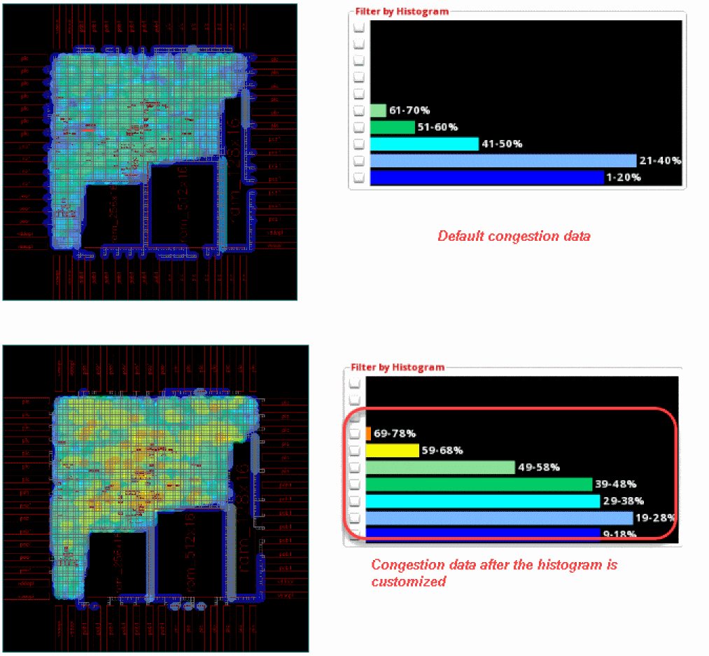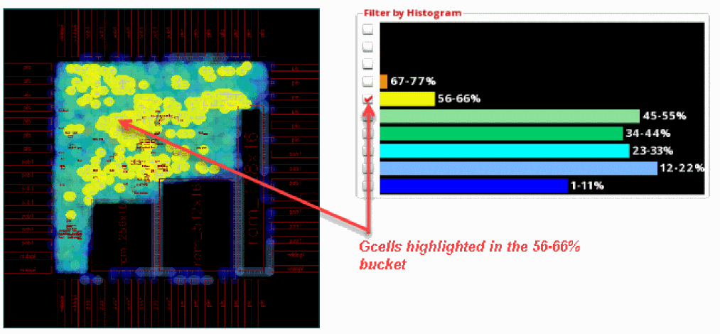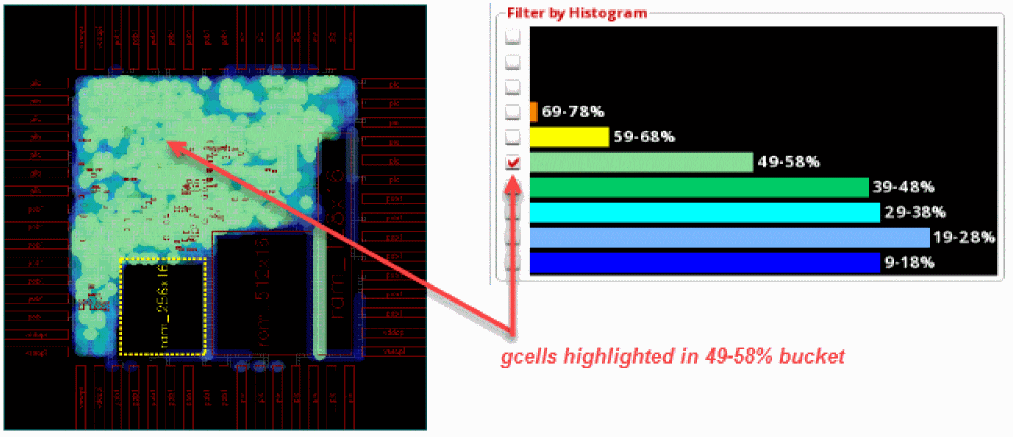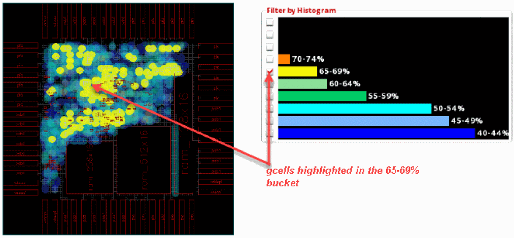 Now, click the check box next to the 65-69% bucket. The gcells in this bucket are highlighted in the heat map and the global cell track utilization table.