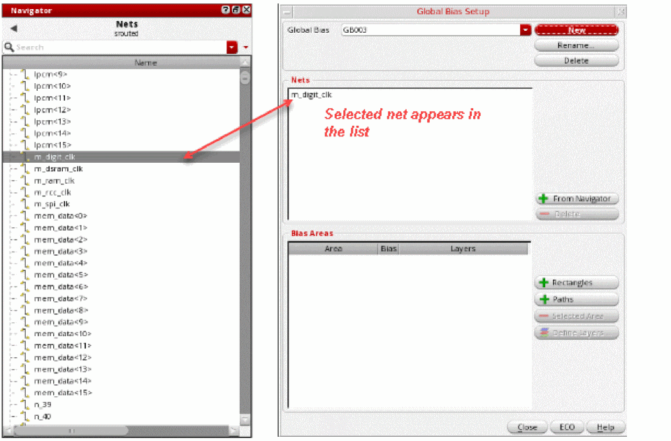 The form is updated to create a default group named as GB003. This is an auto-generated global bias name. Also, the net selected in the Navigator assistant appears in the Nets list box.