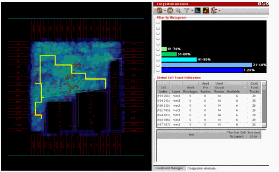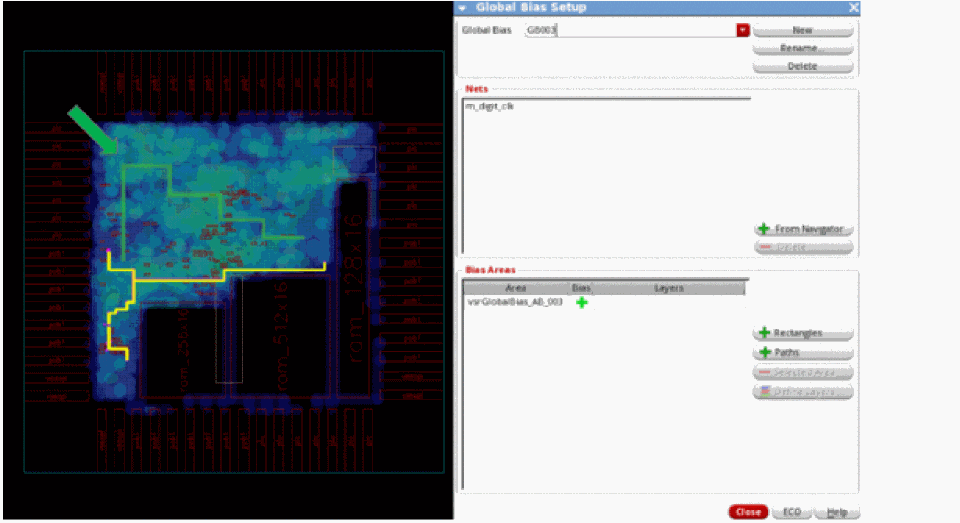 To see how the new constraint alters routing and congestion, click the ECO button in the Global Bias Setup form or click the Global Route and ECO Congestion Analysis option from the Congestion Analysis drop-down list.