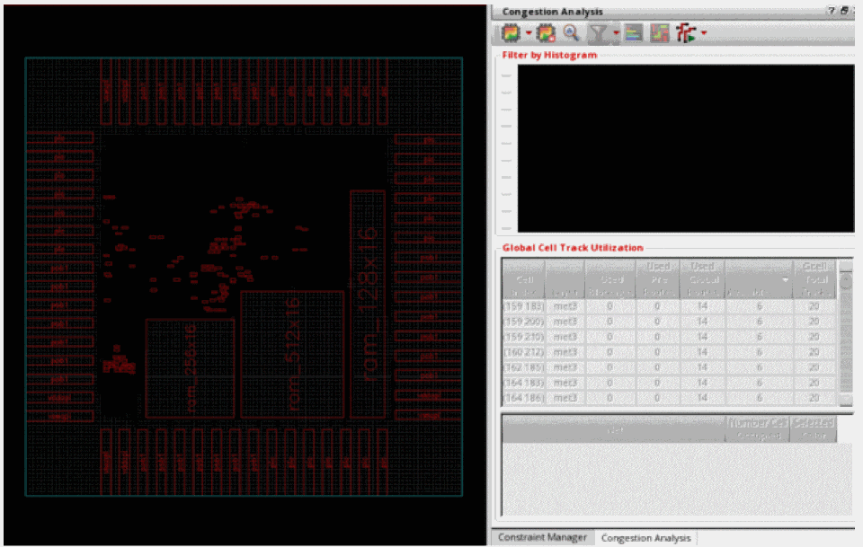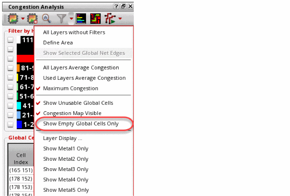 At times, it is useful to visualize parts of a design that have zero percent congestion. This can help in identifying regions that could be used to add additional structures such as hard macros, soft blocks, or routing. Alternatively, this can help to identify regions in a design that could be removed or compacted in order to shrink a design during floor-planning. To only show gcells with zero percent congestion, perform the following steps.