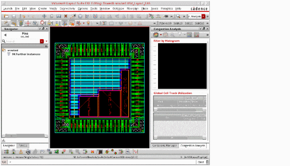 To load the Congestion Analysis workspace, choose Windows – Workspace – Congestion Analysis. The Congestion_Analysis workspace displays the Navigator assistant, Palette assistant, and the Congestion Analysis assistant.