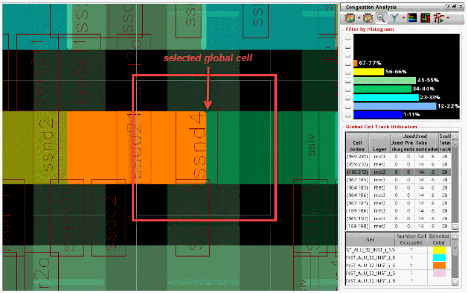 You can use the global cell track utilization table to quickly find the most congested gcells in the design. In addition, explore the objects causing that level of congestion and also view the selected gcell(s) in the heat map by zooming in.