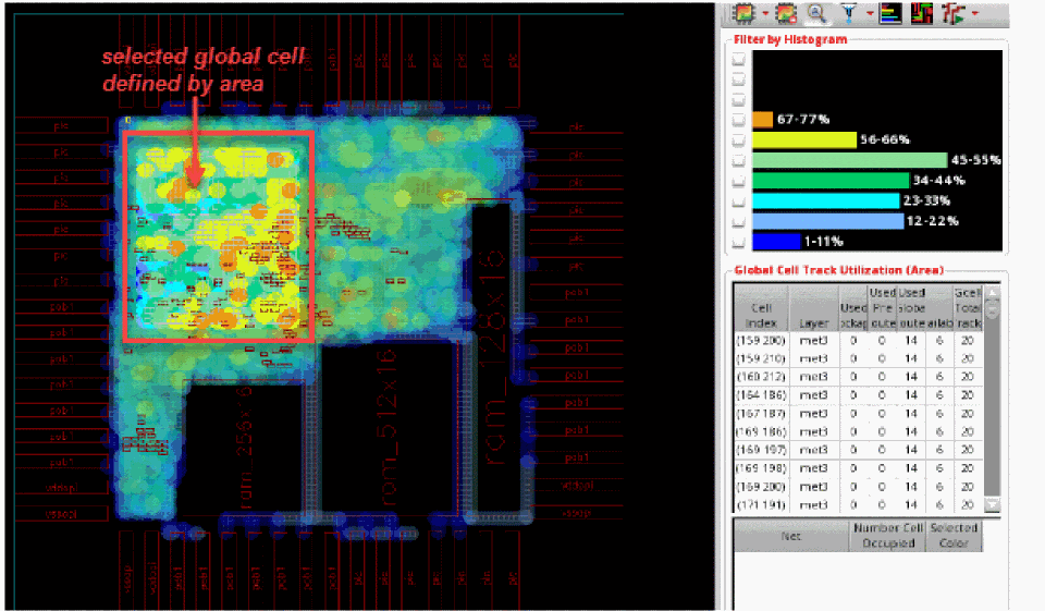 The non-selected gcells are dimmed. Also, the histogram and the global cell track utilization table is updated to indicate only the selected gcells.
