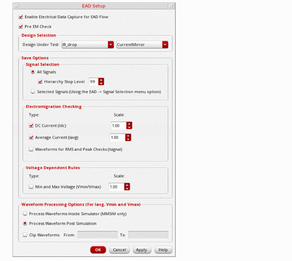 Alternatively, you may want to reuse the results saved in the CSV datasets, and run a what-if analysis by making some changes in the setup, for example, changing the EM temperature or electrical data in the dataset. You can then run the EM checks using the EAD Browser in Virtuoso Schematic Editor, as explained below.