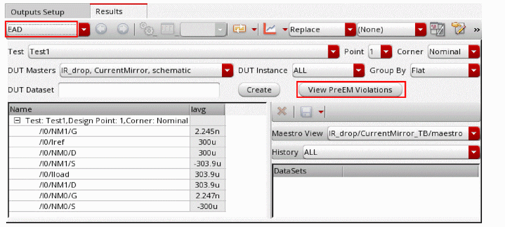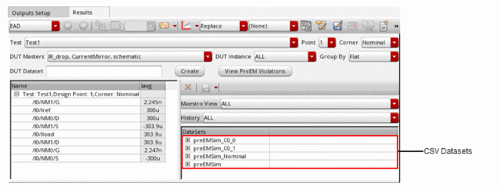 During the simulation run, a scratch layout is internally created and the pre-EM check is run on the scratch layout. After the simulation is complete, electrical data is automatically saved as CSV datasets and a pre-EM report is generated.