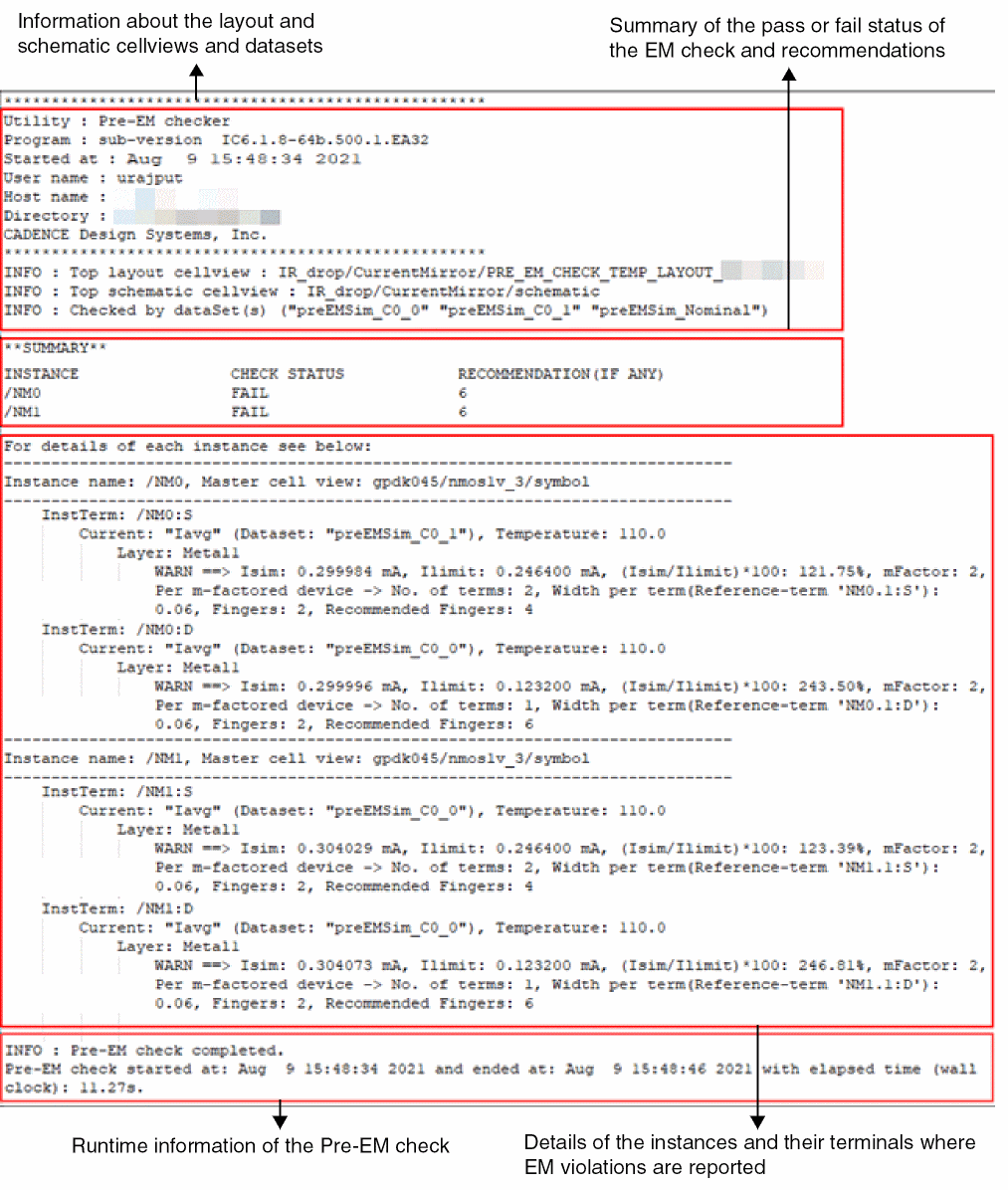 Running the pre-EM check automatically creates a scratch layout view based on the device parameters that you specify. It then runs the EM check on the scratch layout and generates a report that lists EM violations. The report also provides recommendations on how to resolve the reported violations, if any.