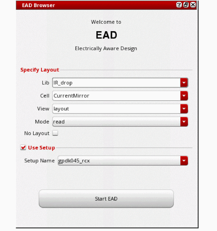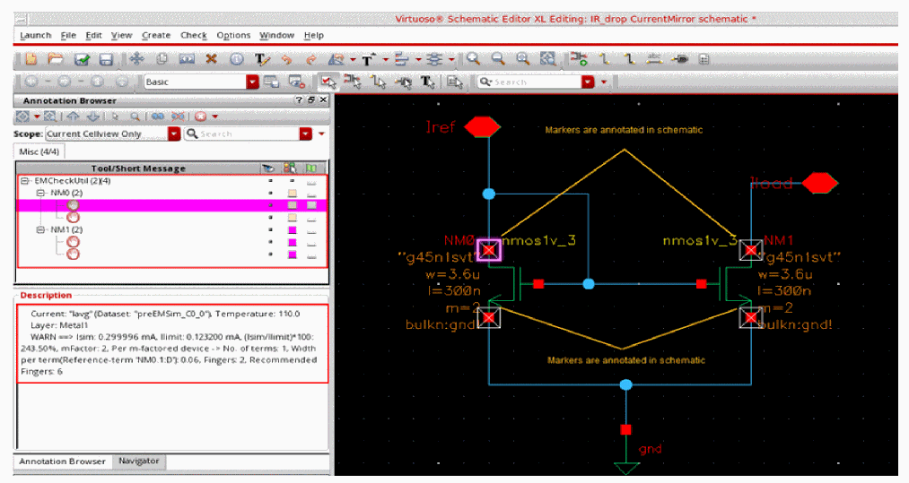 Pre-layout EM check on a schematic help you find whether the MOS device terminals carry more current than the maximum allowed current based on the pin layer shape and size. The limits for each conductor are specified in the EAD technology file. In case of EM violations, EAD may recommend number of fingers or fins for a given device to be EM-compliant.