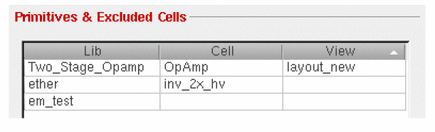 The cellviews to be excluded from parasitic extraction. Parasitics are extracted up to and including the terminals of the excluded cells, but no extraction is performed inside the specified devices. Click Add to add a row to the table, and type the required library, cell, and view names into the fields provided (or choose the names from the drop-down lists). If you do not specify a cell or view name, then all cells or views are excluded. For example, the table below specifies the following exclusions: