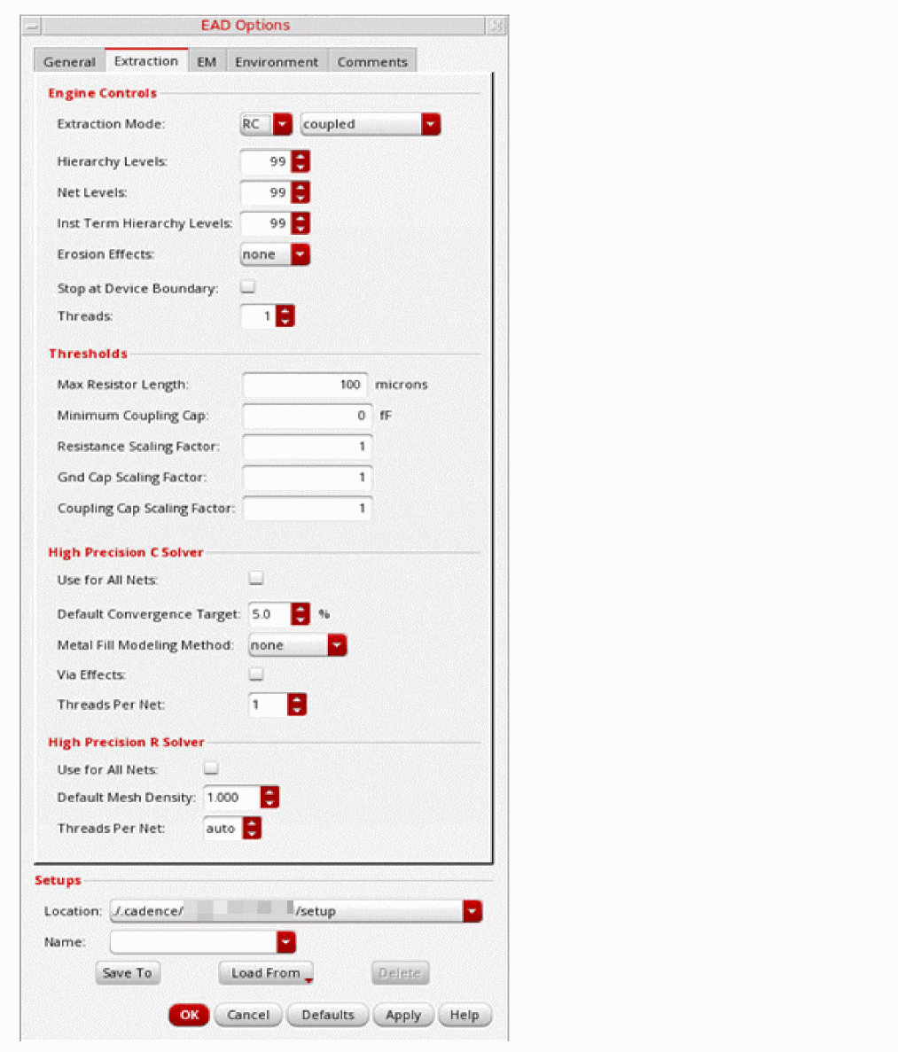 The types of parasitic networks produced by the EAD extractor. Choose the mode (RC, C, or R) from the first pull-down and, where appropriate, the capacitance coupling type (coupled, decoupled, or lumped coupled) from the second pull-down. Environment variable: type |