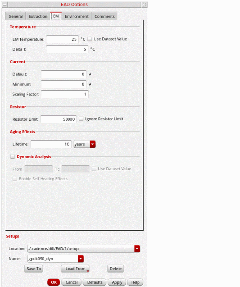 The lifetime to be used for risk-based EM analysis. In risk-based EM analysis, MTTF (Mean Time To Failure) is first calculated using Black's equation. The calculated value is then used together with the specified lifetime to determine the probability of EM failure. Specify the value in the text field and choose either years or hours from the pull-down list. Environment variable: lifetime and lifetimeUnits Note: This field is disabled when the EM Data Source is set to EM data files in the EAD Process Settings – Corners form. |