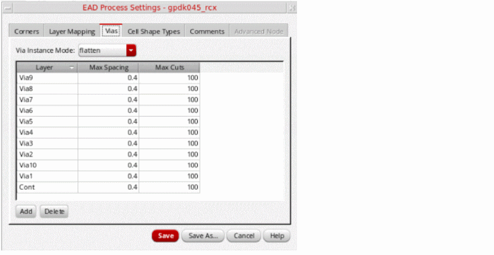 The details of via layers are imported from the .ini files. If required, you can manually add or delete via layers by using the Add and Delete commands given below the Vias table.