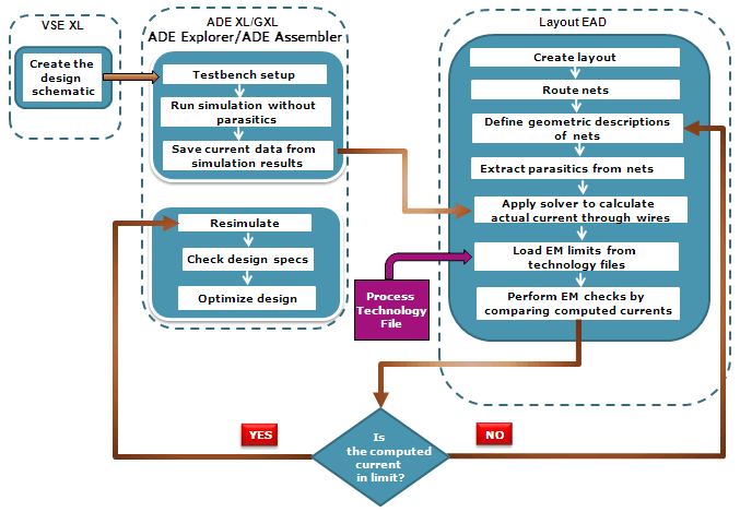 The EAD flow in Virtuoso involves various steps to perform comprehensive EM checks for your design and make it electrically correct. The following section provides a brief description of this flow.
