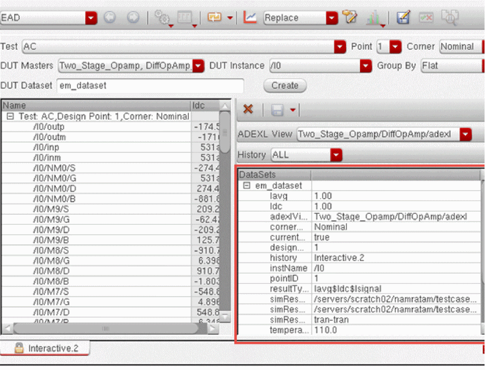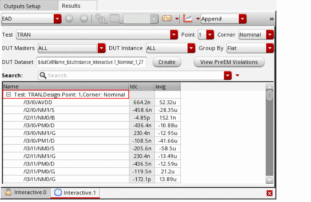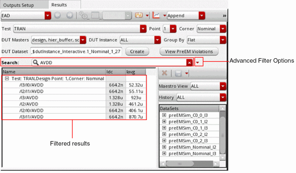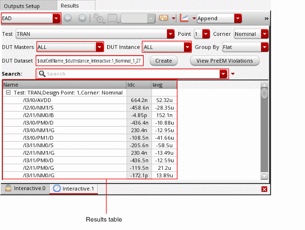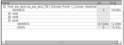 The current data, Idc and Iavg, for the selected signals is saved as part of the testbench results. To view this data, ensure that the results of the correct history are loaded and select the EAD view on the Results tab of the Design Environment XL window.