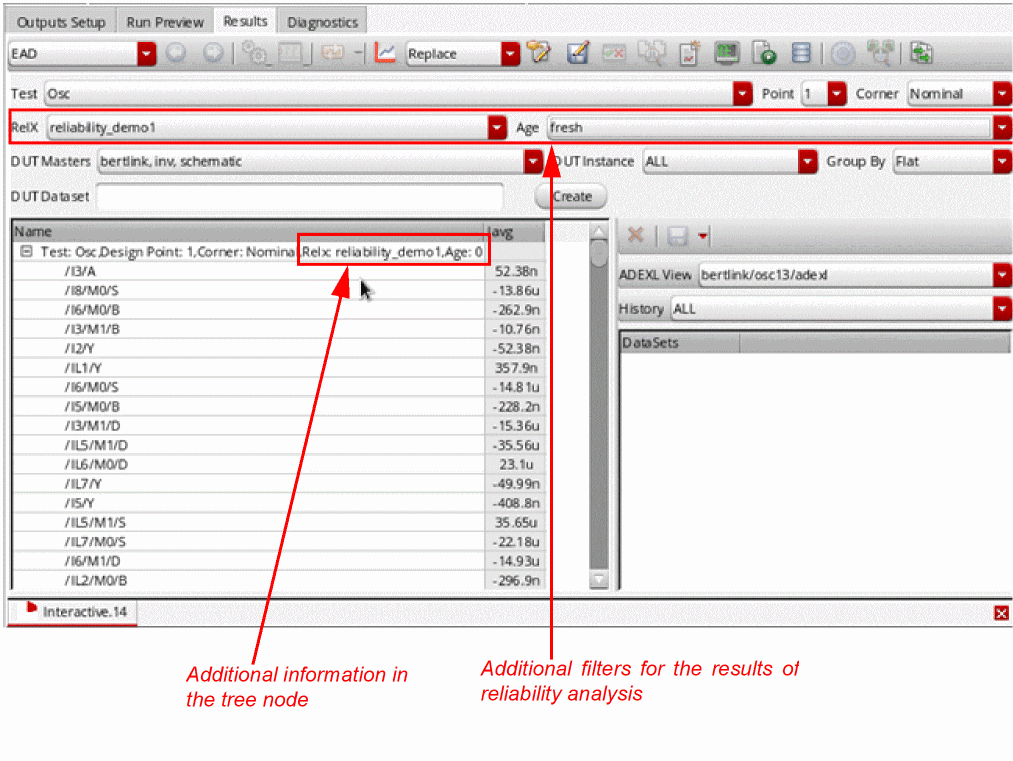 When the ADE Assembler simulation is run for reliability analysis, and the results data is saved for fresh, stress, and aged tests, additional drop-down lists are displayed on the Results tab, as shown below.
