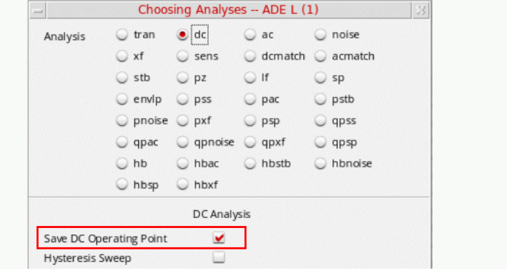 For DC analysis, enable the Save DC Operating Point check box to save the simulation data. Otherwise, the dataset would remain blank.