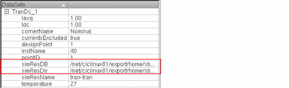 By default, a dataset includes the absolute paths to the simulation results psf directory and the results database (rdb file) where the current data is saved. These paths are saved and displayed as dataset properties in the constraint cellview, as shown in the figure below.