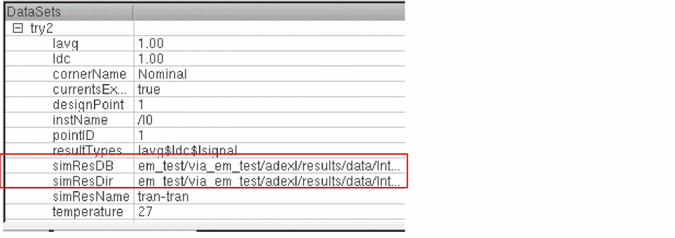 If the simulation results contain both the current and voltage data (because you had selected the check boxes in both the Electromigration Checking and Voltage Dependent Rules sections on the EAD Setup form), separate datasets are created for the current and voltage data. The dataset names are suffixed by_Ior_Vto identify the dataset type.