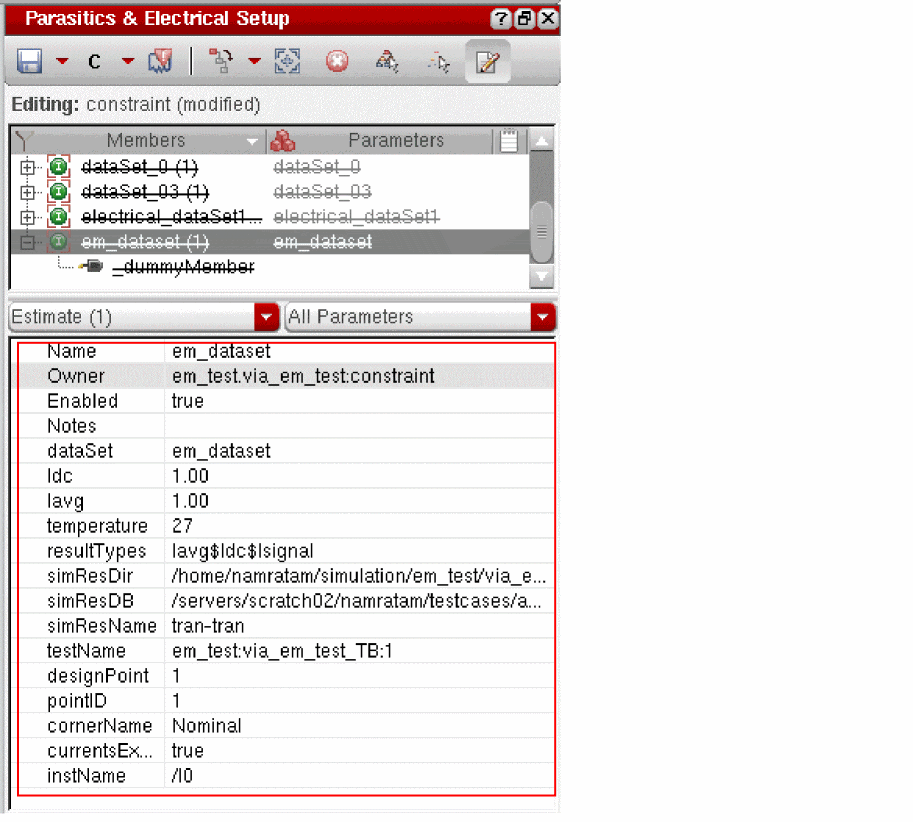 simResDBandsimResDirpaths saved in the constraints view are used to load the datasets in the EM Dataset drop-down list on the EAD Browser in Layout EAD. Also see EM Dataset.