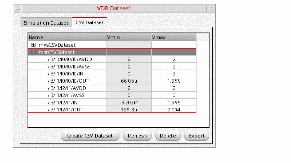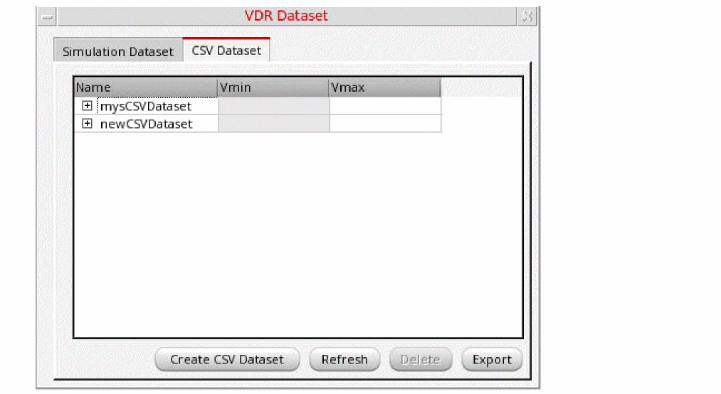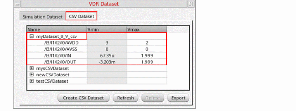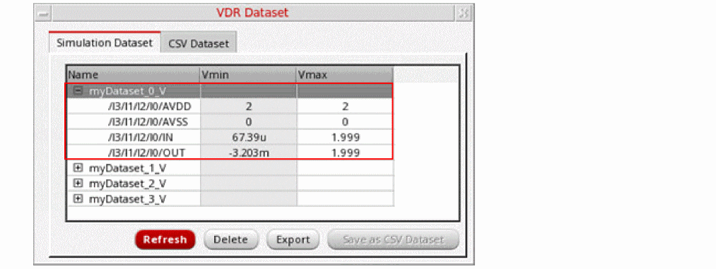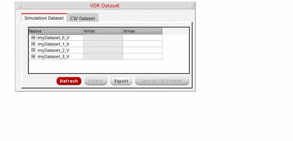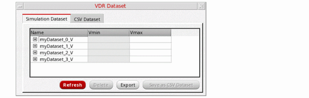 The VDR Dataset form enables you to view, refresh, and delete voltage information derived from simulation datasets. The form lists the nets in each dataset and the minimum and maximum voltages allowed for each net. You can also create a new CSV dataset from an existing CSV file.