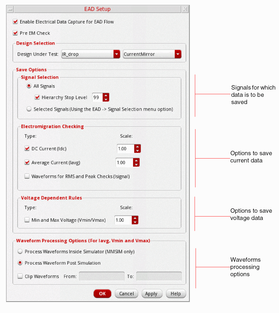 The Save Options section of the EAD Setup form specifies the signals for which you need to save the electrical data from the simulation results.
