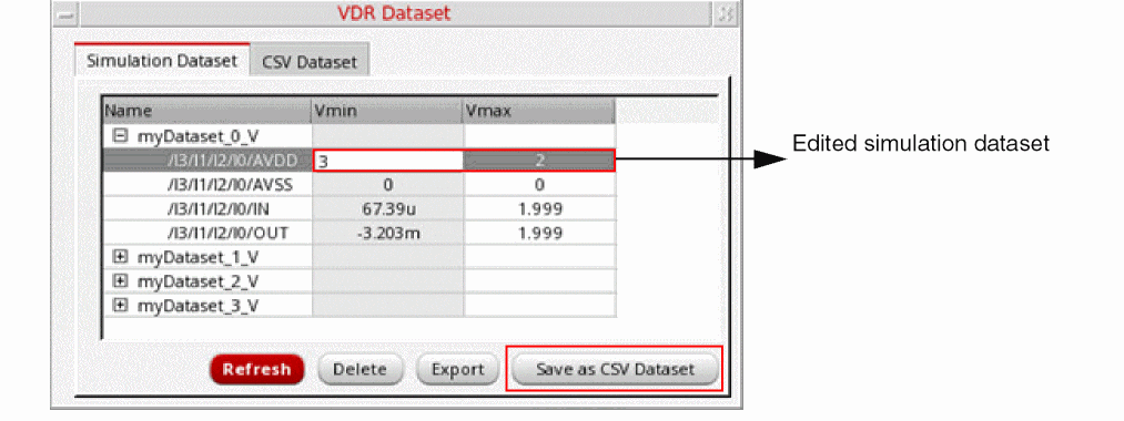 Double-click the cells in the Vmin and Vmax columns to edit the minimum and maximum voltages for the nets in the datasets.