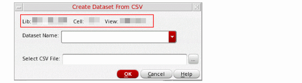 The Create Dataset From CSV form opens, displaying the library cellview information of the currently selected DUT master.