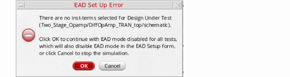 Similarly, in the Voltage Dependent Rules flow, if you do not select any net, a similar message is displayed to either disable the EAD mode or to select nets on the schematic.