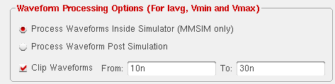 Clip Waveforms: If you know the time interval for which the electrical data is relevant, select the Clip Waveforms check box and specify the time interval in the From and To fields. You can also use VAR expressions in the From and To fields. For more information, refer Virtuoso ADE Assembler User Guide.