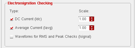 The scale factor is used to scale the current data only while transferring the scalar currents from the schematic to the layout view. It is also possible to specify a scaling factor on the EM tab of the EAD Options form. The default scale factor for both DC current and average current is set to